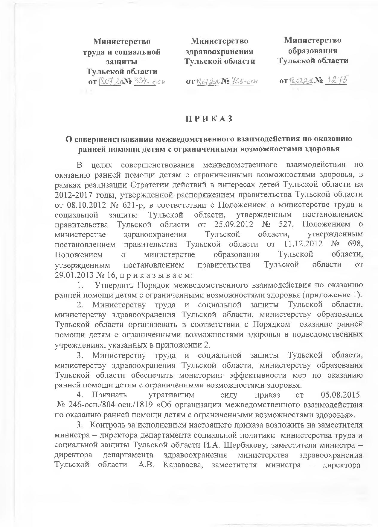 - Приказ о совершенствовании межведомственного взаимодействия по оказанию ранней по-мощи детям с ограниченными возможностями здоровья