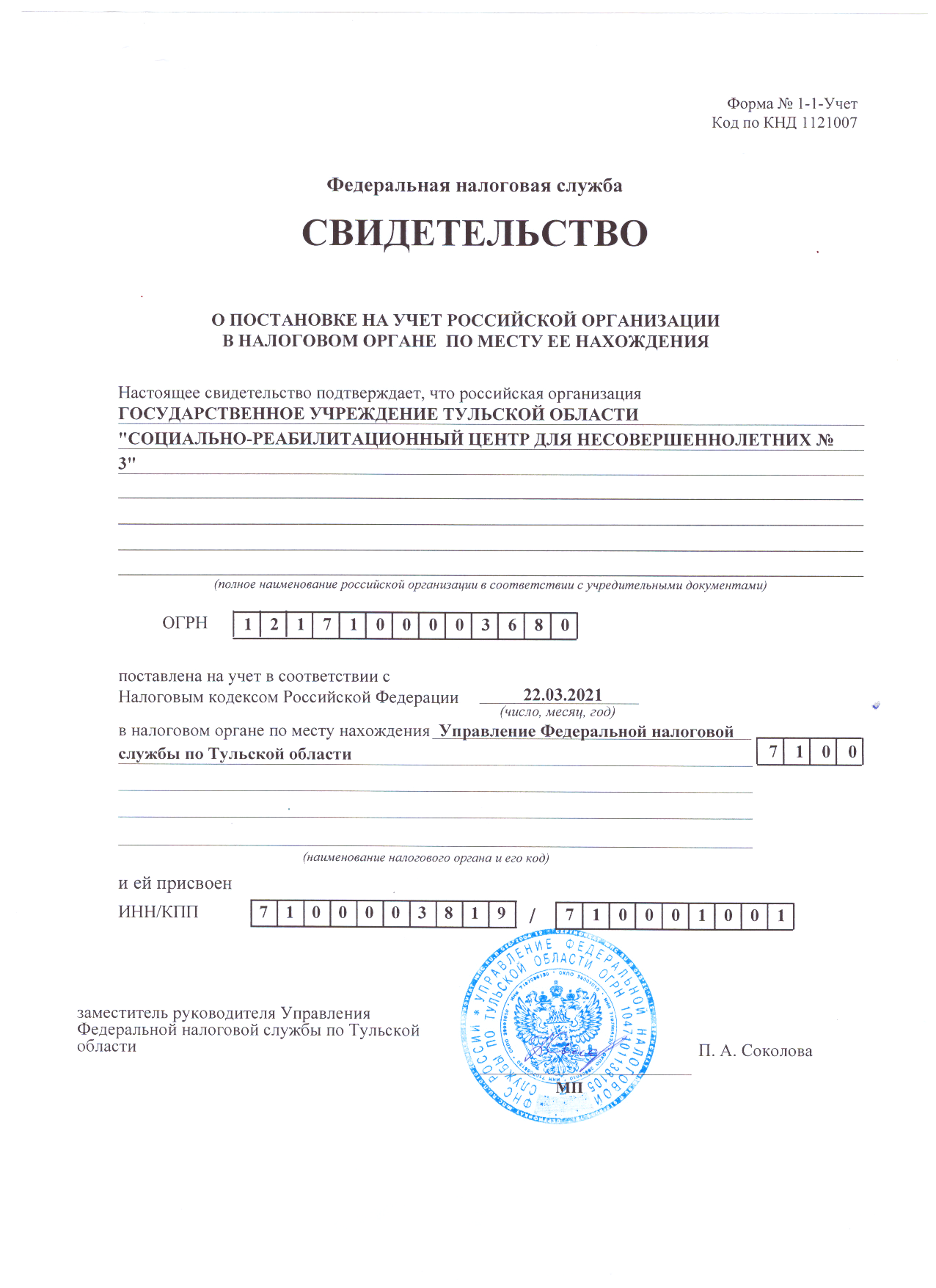 Свидетельство о постановке на учет российской организации в налоговом органе